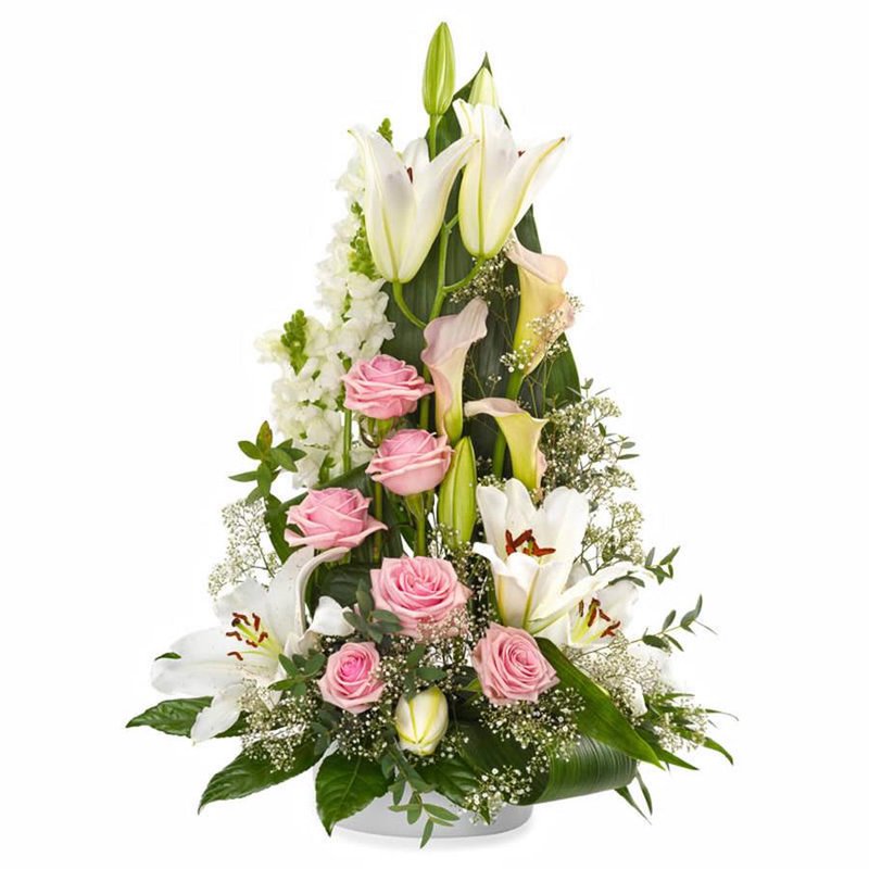 Lilie, róże, zantedeschie i lewkonie to kwiaty, z których składa się kompozycja liliowa. Całość utrzymana w białym i różowym kolorze. Istnieje możliwość dołączenia bileciku z życzeniami. Wykonanie: lokalna kwiaciarnia Euroflorist.