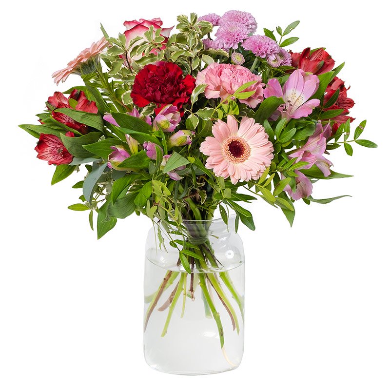 Harmonijna mieszanka czerwonych, różowych i jasnofioletowych kwiatów, takich jak róże, santini, gerbery, alstremerie czy goździki, ten bukiet oddaje esencję radości i witalności. Żywe odcienie i różnorodne tekstury tworzą wesołą aranżację, która łączy w sobie to, co najlepsze: piękno i niską ceną.